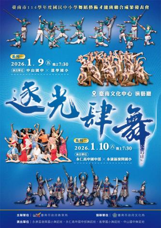 「逐光肆舞」臺南市114學年度舞蹈藝才班聯合展將於1月9日及10日在臺南文化中心演藝廳舉辦,教育局長鄭新輝率領永仁高中國中部、中山國中、永康區復興國小及進學國小4校舞蹈班校長與學生共同入鏡拍攝宣傳影片,為活動揭開序幕。今年舞展採兩場接力演出形式規劃,舞碼編排與舞台燈光全面升級、創意十足,勢必帶給觀眾嶄新的視覺震撼,精彩可期、不容錯過。