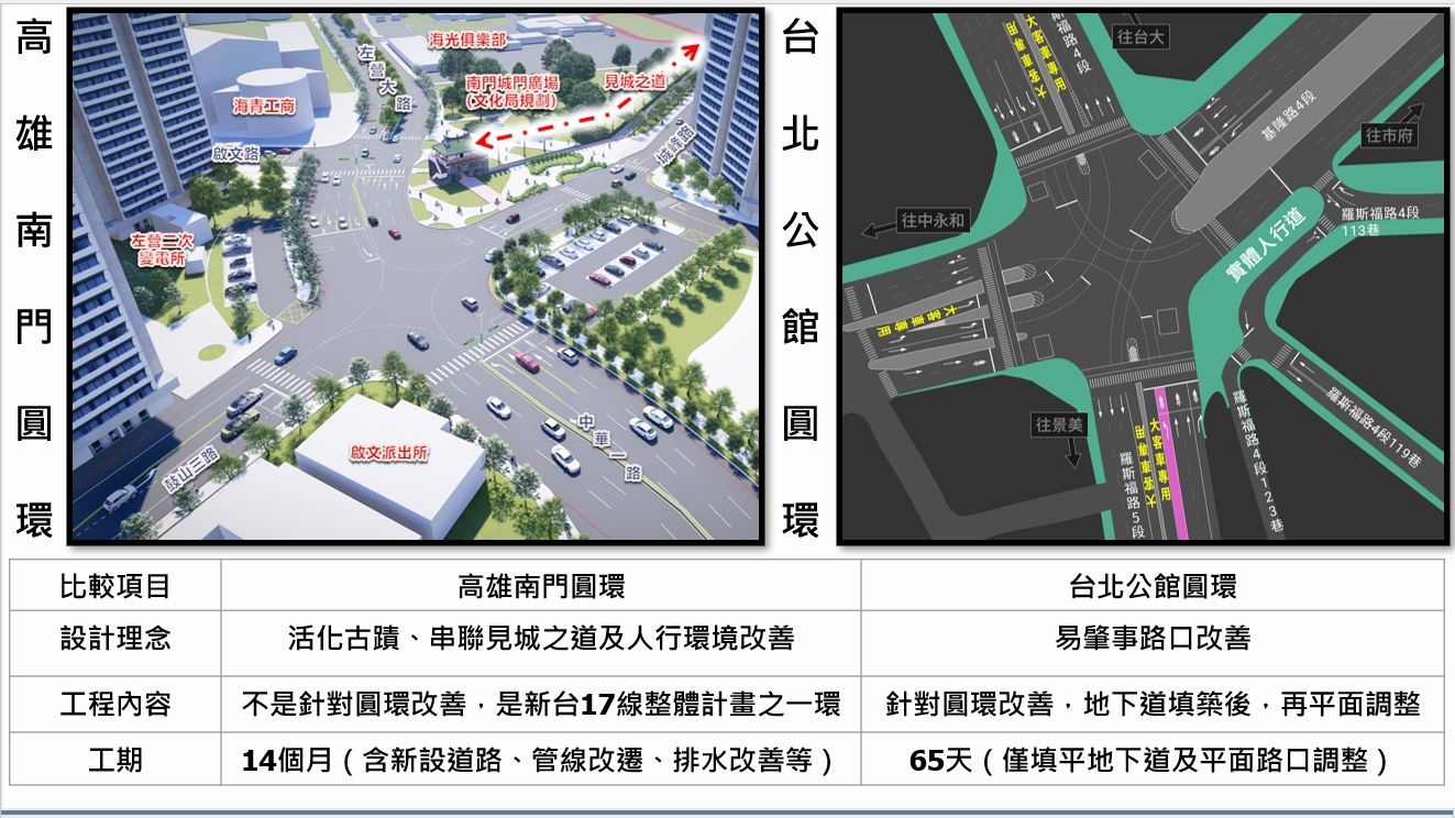 針對網路有網友質疑南門圓環較台北公館圓環施工期長且經費高事宜,高市工務局強調,這是新台17線道路整體改善工程,與台北公館地下道填平工程在工程量體、設計概念都不同,不適合比較。