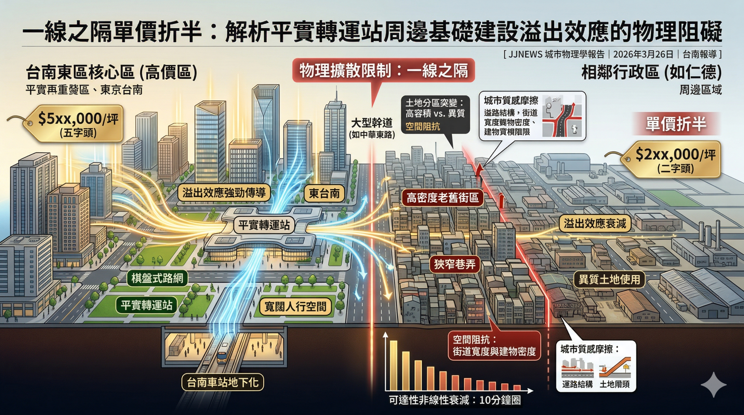 在2026年的都市發展進程中,大型基礎建設如平實轉運站與台南車站地下化,被視為驅動區域價值的核心引擎。理論上,這些引擎產生的經濟產值應隨物理距離向外輻射,帶動周邊地價同步上揚。然而,台南東區與相鄰行政區之間目前顯著的房價斷層,正揭示了溢出效應在傳導過程中存在著強大的物理擴散限制。這種價值的傳導並非線性擴張,而是受到城市紋理、路網結構與土地分區的強力攔阻,當物理阻礙超過臨界點,價值擴散就會產生斷裂,形成所謂一線之隔、單價折半的奇特景觀。