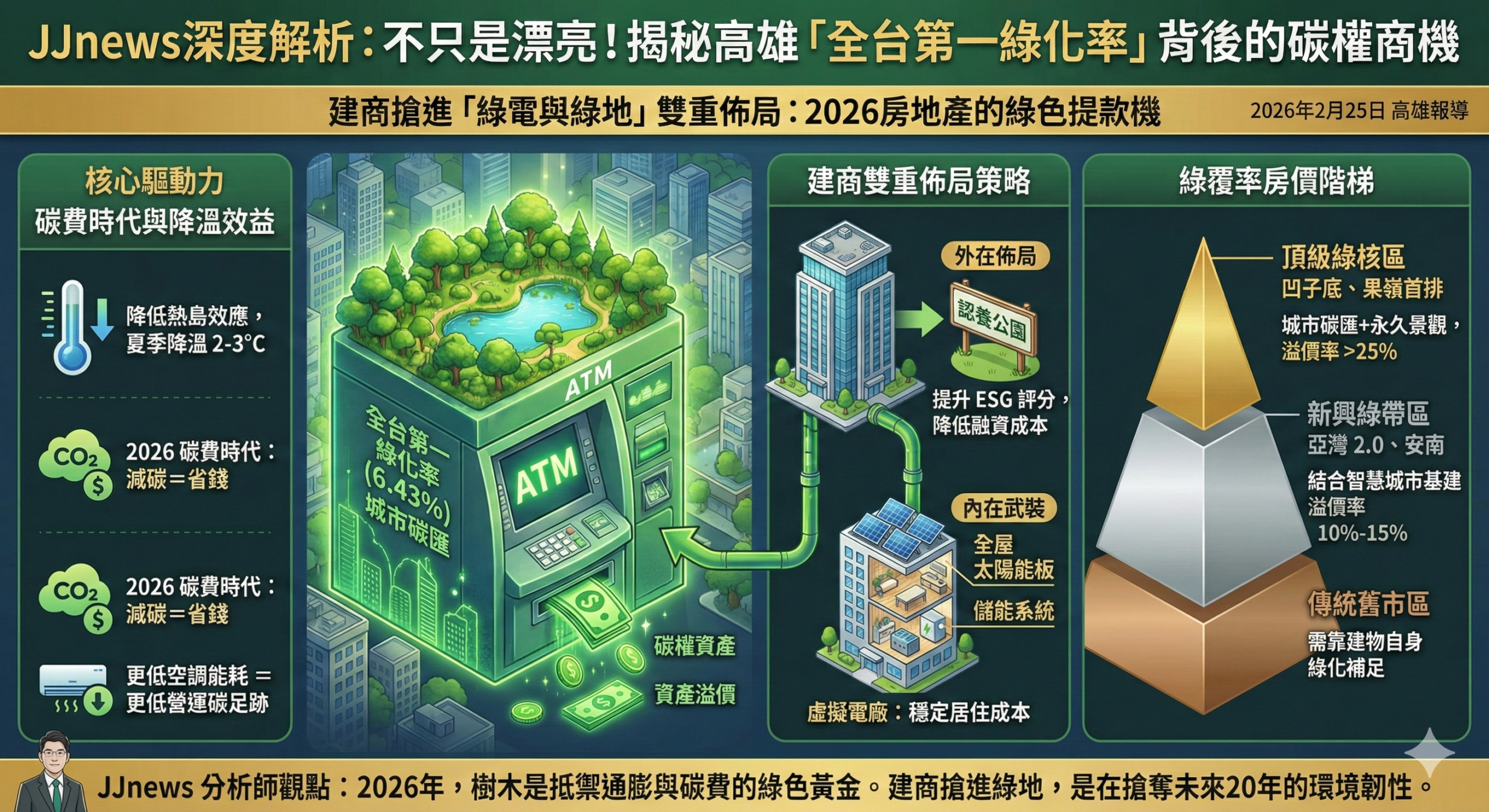 過去衡量房地產價值在於地段,但在 2026 年的經濟邏輯下,碳權成為了新的衡量標準。高雄市境內 2,723.27 公頃的綠地,在碳中和趨勢下等同於一座巨大的城市碳匯。開發商紛紛搶進公園周邊,背後的策略極為深思熟慮:這是一場利用綠地對沖建築碳成本,並透過綠電設備建立品牌護城河的雙重豪賭。