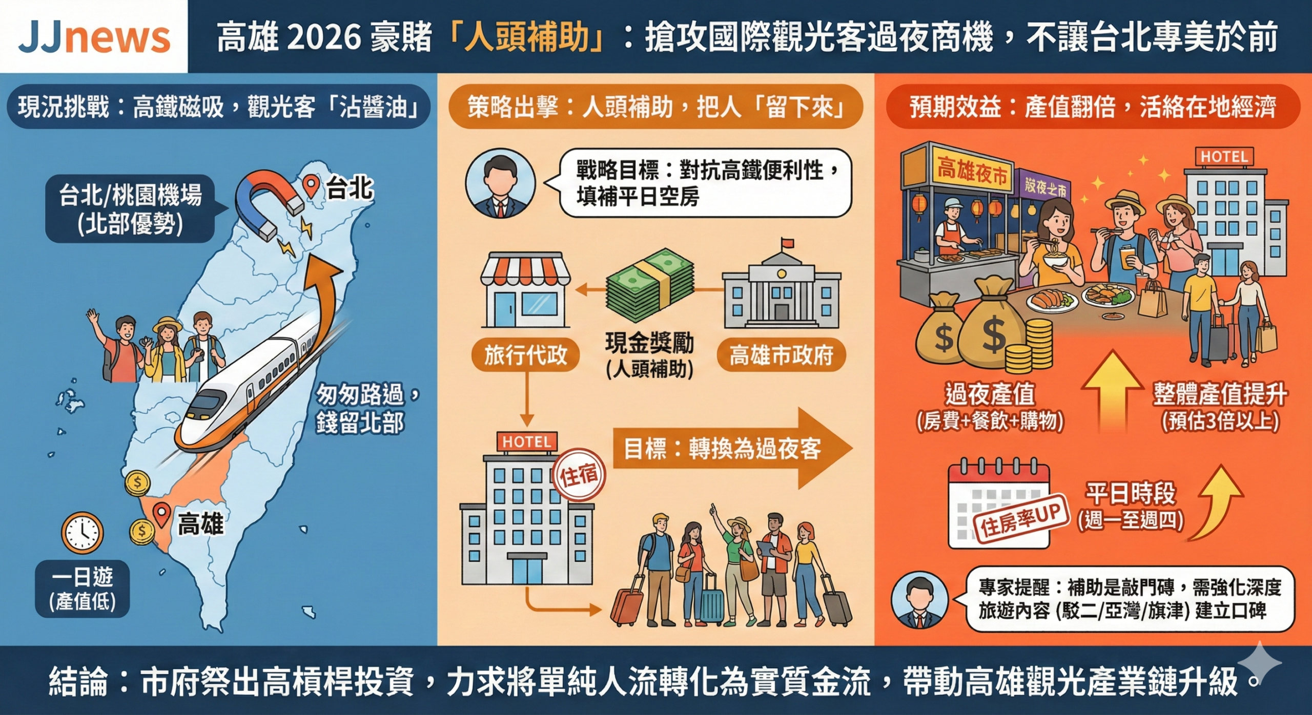 市府之所以特別強調必須住宿才能獲得獎勵,是因為根據觀光經濟學的邏輯,過夜旅客的產值遠高於一日遊旅客。以往外國遊客可能只是搭高鐵南下沾個醬油就離開,高雄只能賺到簡單的餐飲費用;一旦旅客留下來過夜,消費鏈將擴大至飯店房費、晚餐、夜市宵夜以及購買伴手禮等,預估整體產值相差三倍以上。市府期望透過發放補助款這項高槓桿投資,有效地將單純的人流轉化為實質的金流,帶動在地經濟。