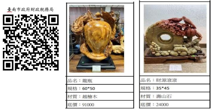 財政稅務局表示,標售作品包含木雕與石雕等藝品,標價介於4,000元至9萬1,000元之間,展覽期間每天上午10時至下午4時開放,民眾可近距離欣賞,再填寫投標單參加競標。3月3日上午10點,將在致遠樓5樓國際會議廳舉行正式開標。完整標售清單與資訊,可至臺南市政府財政稅務局網站或透過QR-Code查詢。