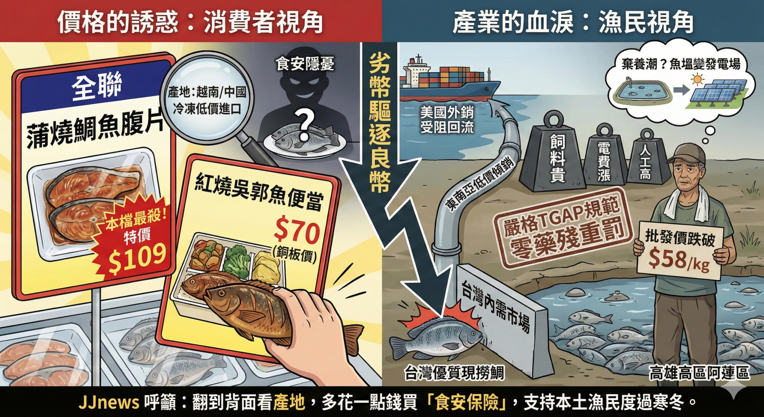 食安雙標更是隱形的威脅。台灣鯛養殖戶被要求遵守嚴格的 TGAP(台灣良好農業規範),用藥紀錄與水質檢測必須公開透明,稍有殘留便面臨重罰。反觀部分進口魚片僅採邊境抽驗模式,產地是否使用台灣禁用的抗生素或保鮮劑超標,在低價的掩蓋下往往被視而不見。這導致我們用最高標準勒死本土漁民,卻用寬鬆標準讓進口魚進入國民餐盤。如果不救這個產業,漁民撐不過寒冬恐引發棄養潮,魚塭甚至可能變質為「有電無漁」的發電場,危及未來的糧食安全。
