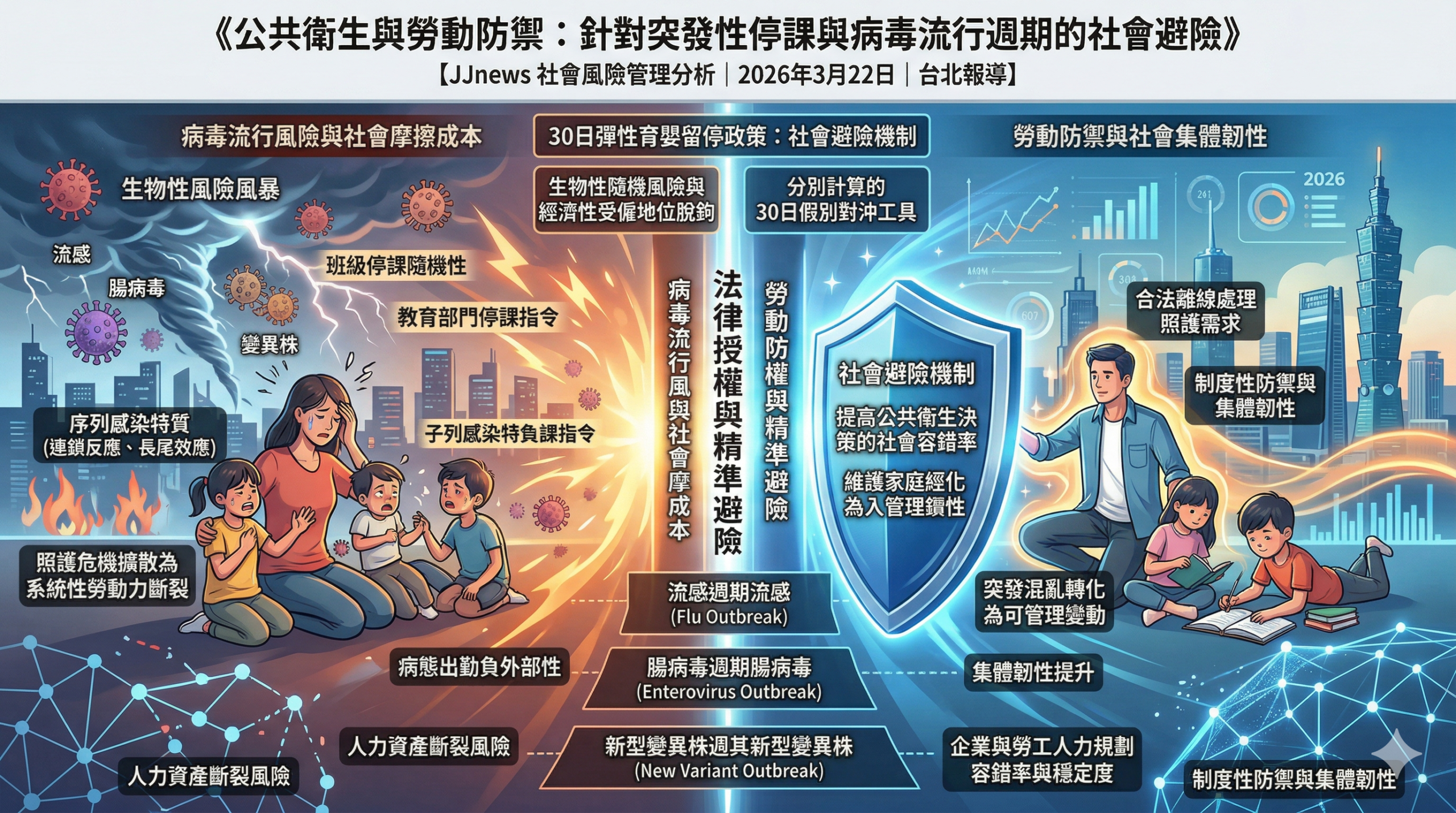 在2026年的今日,傳染病的流行週期已演變為勞動力市場中不可忽視的非對稱風險。無論是流感、腸病毒還是各類新型變異株,其爆發頻率與不可預測性正持續考驗著社會的運作效率。勞動部近期針對多子女家庭推出的30日彈性育嬰留停政策,本質上即是一種精準的社會避險機制。透過法律授權,該政策成功將生物性的病毒流行風險與經濟性的受僱地位進行脫鉤,確保家庭在公共衛生事件突發時具備法定的防禦空間,有效防止個體家庭的照護危機擴散為系統性的勞動力斷裂。