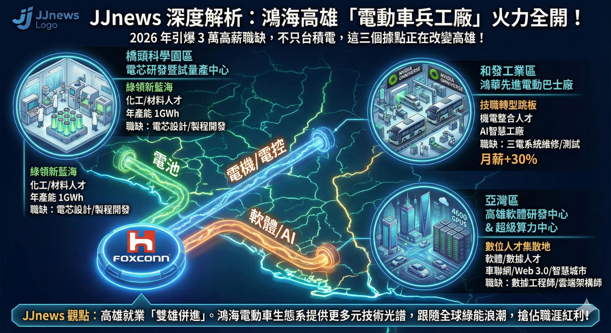 2026 年的高雄,在「半導體 S 廊帶」之外,另一個強大的經濟引擎「電動車生態系」已正式轉速全開。鴻海集團自 2023 年與高雄市政府簽署投資意向書後,不僅將亞灣區打造成集團軟體研發基地,更接連在橋頭與和發工業區啟動大規模量產計畫。隨著鴻華先進在橋頭科學園區的電動巴士(Model T)工廠正式投產,加上高雄超級算力中心預計於 2026 年第四季啟用,鴻海在高雄佈局的「三電(電池、電機、電控)」版圖已從願景化為實體,並釋出數以萬計的多元職缺。