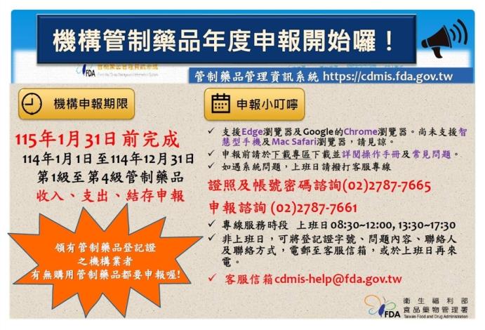領有管制藥品登記證之機構應依規定於115年1月31日前辦理114年1月1日至114年12月31日期間管制藥品收支結存情形之申報作業。申報操作手冊可於管制藥品管理資訊系統(https://cdmis.fda.gov.tw)「下載專區」下載。於申報截止日前,可隨時上網申報,倘申報資料有誤植、疏漏,亦可於申報期間自行上網修正。申報操作問題可先參考網站首頁「常見問題」或洽系統客服(管制藥品證照及登入諮詢:02-27877665;管制藥品申報諮詢:02-27877661,服務時間:週一至週五上班日上午8:30~12:00、下午1:30~5:30,電子信箱:cdmis-help@fda.gov.tw)。