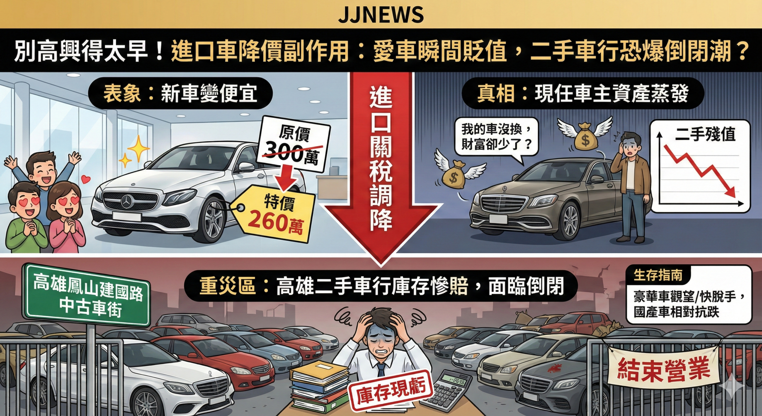 聽到進口車可能因為台美貿易談判而大幅降稅,許多想買車的人都在拍手叫好,期待能用更便宜的價格入手雙 B 或特斯拉。但必須提醒你一個殘酷的經濟學連鎖反應:如果新車變便宜了,你現在開的那台車,或是你剛買的中古車,價值將會「瞬間蒸發」。這是一場全台資產重估的風暴,而海嘯的第一排,就是南台灣數量龐大、資金積壓嚴重的二手車商。