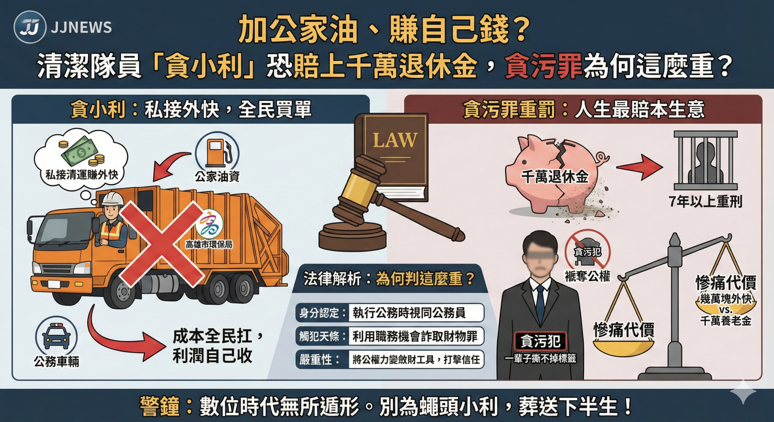 為了賺幾千塊的外快,可能要賠上幾百萬的退休金,甚至面臨 7 年以上的有期徒刑。這筆帳怎麼算都不划算。高雄這幾位清潔隊員的行為,在法律上不僅僅是偷開車或偷油,而是觸犯了公務員最忌諱的天條,也就是利用職務上機會詐取財物罪。為什麼法律對這種小貪要判這麼重?