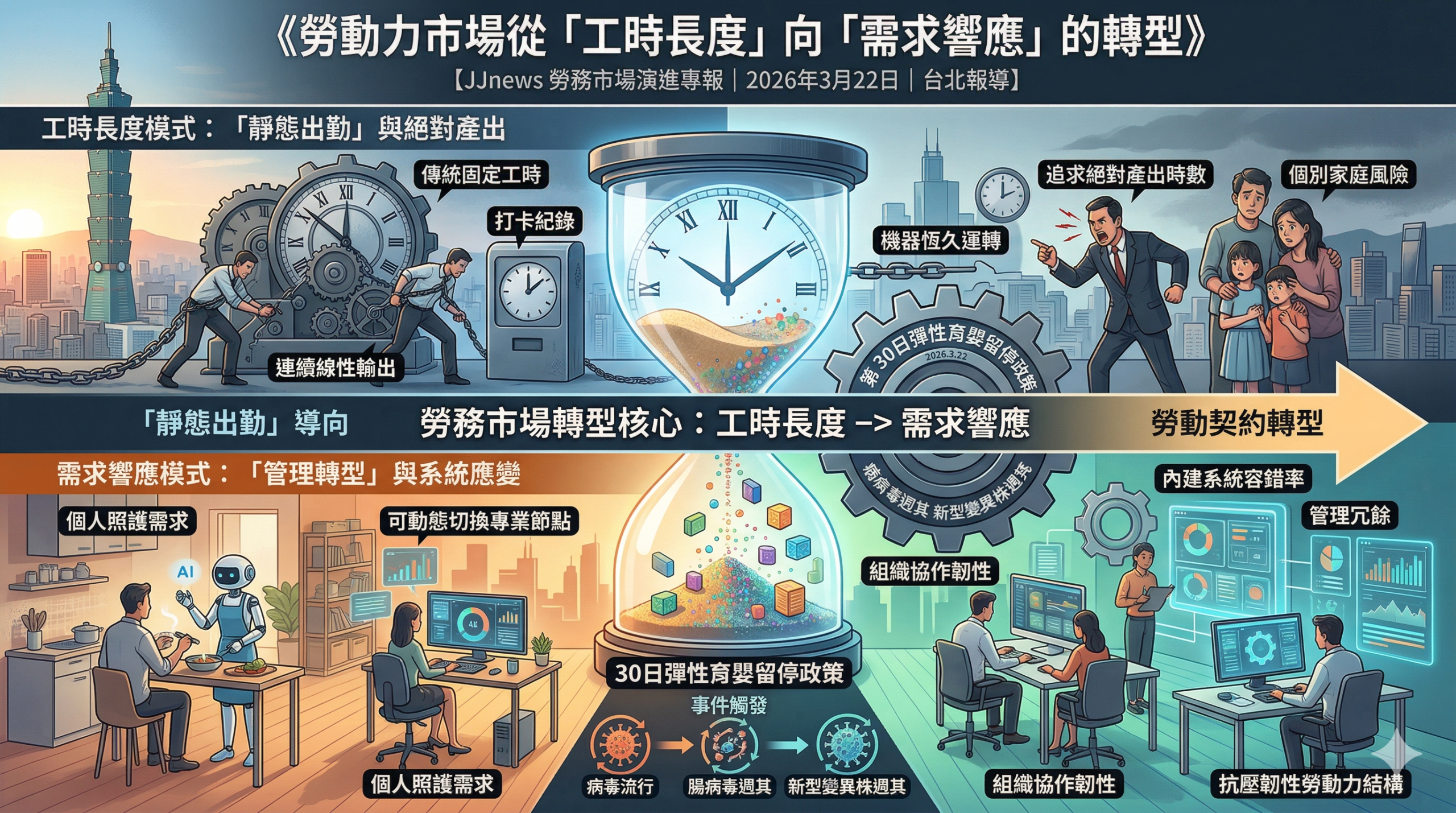 JJnews 分析師觀點認為,勞動力市場的需求響應轉型,實質上是勞動合約對人類生理現實的全面優化。成功的企業不再要求員工像機器一樣恆久運轉,而是建立一個即便有人缺席也能穩定運作的系統。30日彈性假新制是這場轉型的催化劑,它強迫企業升級管理邏輯,從管人轉向管流程。當勞務契約具備了應對家庭需求的能力,這座城市的勞動力結構才會真正具備抗壓的韌性。