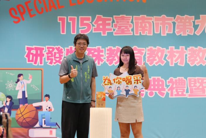 為鼓勵特教教師精進研發教材及教案知能,臺南市辦理第九屆研發特殊教育教材教具競賽,計53件作品參賽,經評審選出特優5件、優等9件、甲等11件及佳作10件,得獎作品合計35件,並於今(23)日在協進國小舉行頒獎典禮,肯定得獎教師透過平時細心觀察各種障別學生學習需求,研發符合個別需求的學習教材,比賽作品既有實用性,又蘊含豐富教學理念及創意。