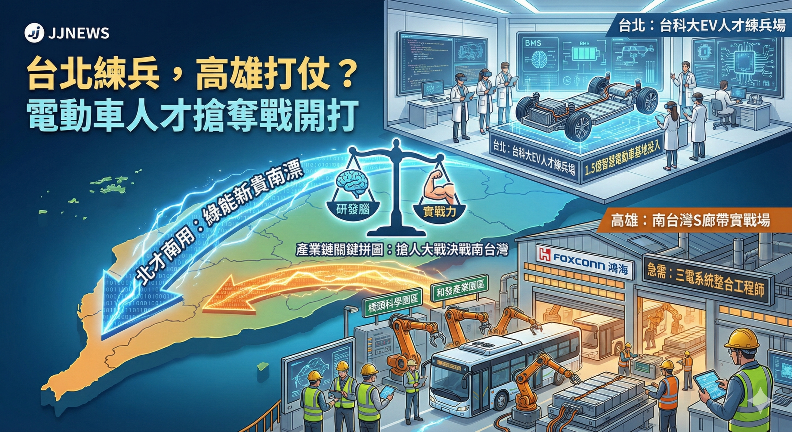 台科大在台北大張旗鼓投入1.5億元成立電動車人才基地,這對於遠在300公里外的南台灣產業界來說,是一則既羨慕又期待的消息。羨慕的是北部豐富且集中的教育資源,期待的是這批人才未來的流向。產業觀點認為,隨著鴻海(Foxconn)在高雄橋頭、和發園區佈局電動巴士與電池廠,一場「北才南用」的趨勢正在成形。未來的劇本很可能是:在台北的實驗室練好功夫,然後南漂到高雄的工廠打硬仗。