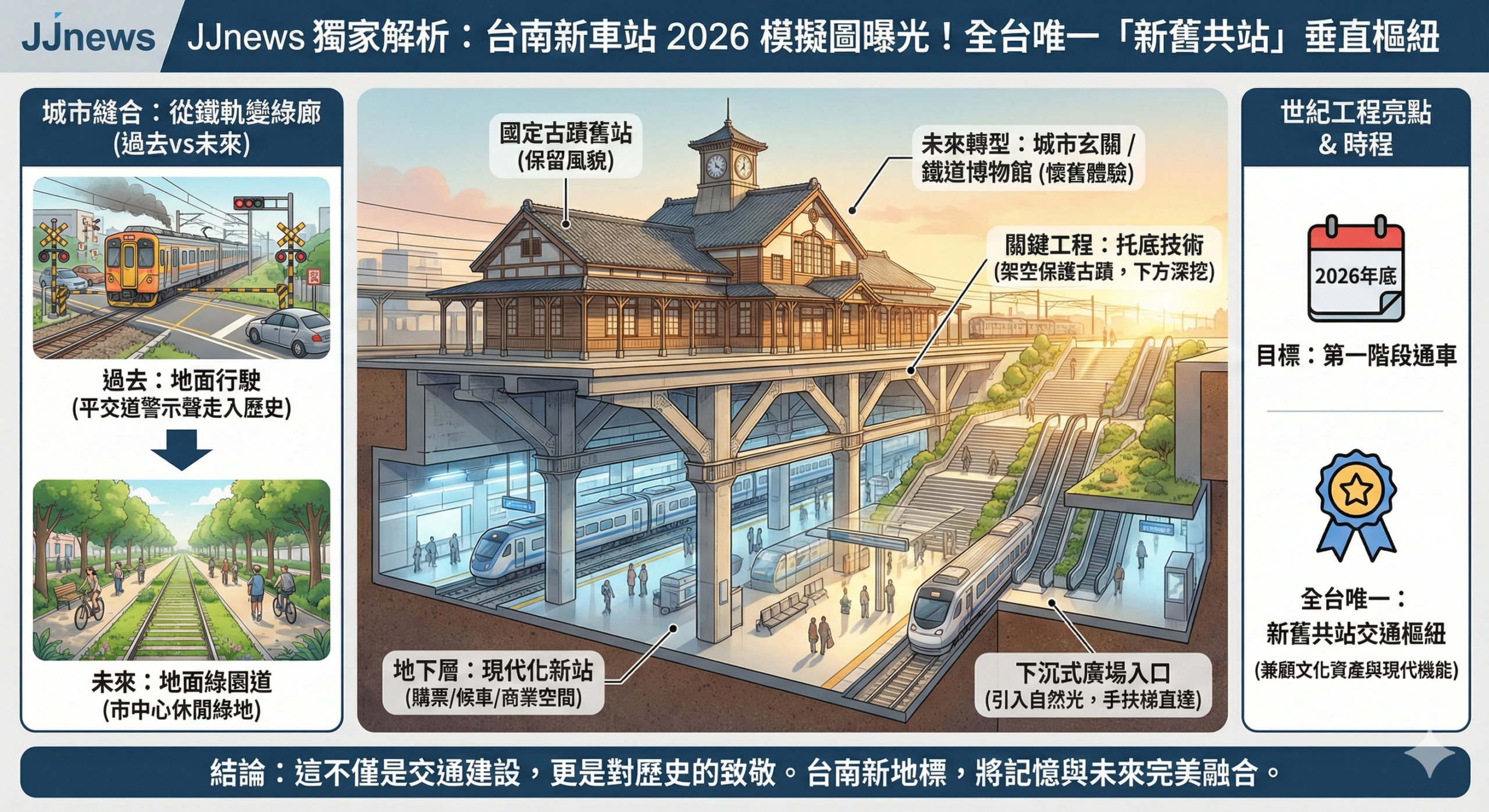 台南鐵路地下化工程預計在2026年底達成第一階段通車目標,交通部鐵道局近期釋出了台南新車站的最新模擬圖。未來的台南車站將採用現代化的下沉式廣場設計,與上方擁有80多年歷史的國定古蹟舊站並存。這將是全台灣唯一一座新舊共站的交通樞紐,不僅展現了工程技術的突破,也兼顧了城市發展與文化資產的保存。
