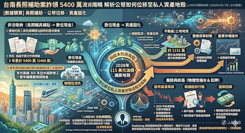 在 2026 年全球能源與通膨劇烈變動的背景下,台南市社會局於 1 月份爆發的 5400 萬元長照補助詐領案引發各界關注。這筆原應支撐弱勢族群的社會補貼款,並未在物理世界中憑空消失,而是透過一套精密的偽造路徑,結構性地滲透進不動產、保單與股市等私人資產地殼中。根據檢調單位的追蹤,這場資金位移路徑揭示了公部門資源在缺乏有效監控時的物理性流失風險。