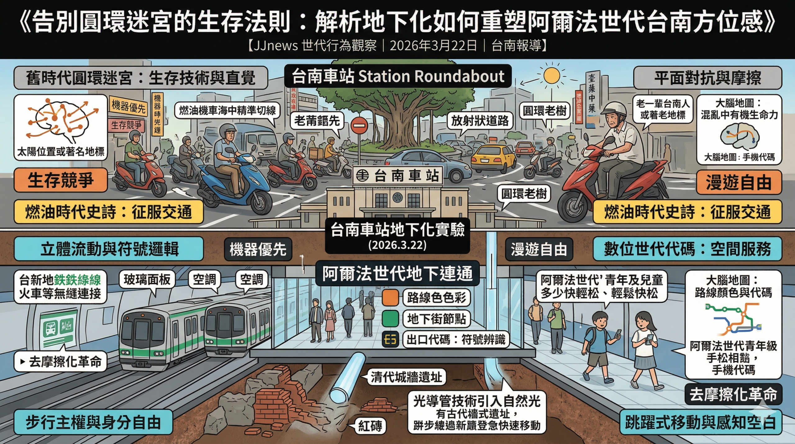對於老一輩的台南人來說,台南車站前的圓環不僅是交通節點,更是一場關於生存體能的成人禮。在那裡,騎士必須具備在機車海中精準切線的直覺,以及在放射狀道路中辨識方位的本能。但隨著捷運綠線地下連通台鐵車站,這場物理性的混沌即將終結。對於 2026 年成長中的阿爾法世代而言,台南的空間邏輯正從平面與對抗轉向立體與流動。當生存不再需要攻略,這群孩子對古城的心理地景正在發生一場前所未有的去摩擦化革命。