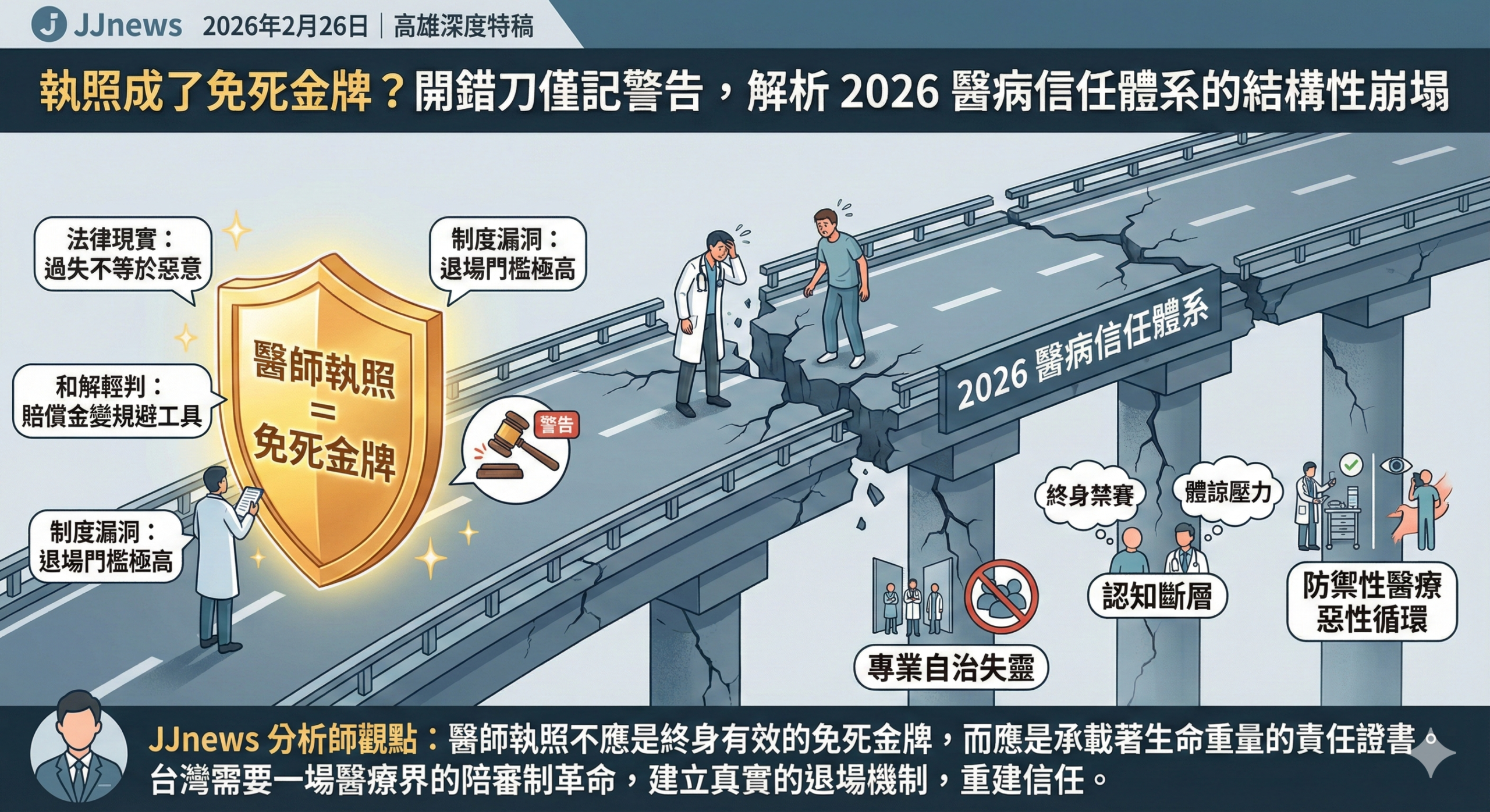 這場判決引發的是台灣醫療環境深層的結構性危機。首先是專業自治的失靈,醫懲會長期由醫界同儕組成,當醫師審判醫師時,天平往往傾向於體諒工作環境與壓力等因素。但在資訊透明的 2026 年,這種缺乏外部監督、甚至排斥病友團體參與的自治模式,已逐漸失去公信力。其次是道歉文化的廉價化,醫懲會以達成和解作為輕判理由,引發社會強烈質疑,擔心賠償金變成了規避行政懲戒的工具,進而讓醫療正義被金錢異化。