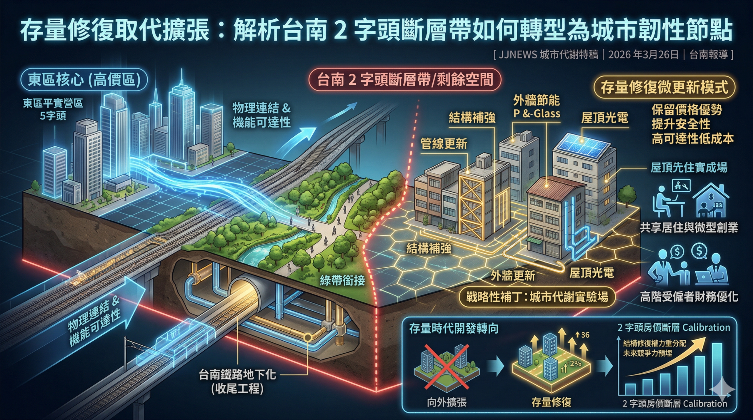 存量時代的開發轉向強調從功能切割走向結構縫合。 20 世紀的都市計畫過度強調行政區的功能劃分,導致東區與鄰近區域在定價上出現劇烈斷裂,但 2026 年的修補主義則聚焦於物理結構的對接。隨著台南鐵路地下化工程進入收尾階段,原有的實體鐵軌屏障消失,這不僅實現了交通通暢,更是對兩側剩餘空間的權力重分配。原本緊鄰鐵道的老舊區塊透過綠帶銜接與巷弄導通進行結構性縫合,使其具備了直接對標東區核心機能的物理條件。此外,存量修復不再追求全面拆除重建,而是透過結構補強、外牆節能與管線更新等微更新模式,在保留價格優勢的同時提升居住安全性。