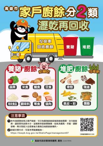 高雄市環保局強調,為提高廚餘再利用效益,轄區各清潔隊垃圾車後方均設有「養豬廚餘」與「堆肥廚餘」兩類回收桶,並設立清楚標示牌供民眾分類投放。環保局提醒,民眾應先將廚餘瀝乾,並剔除塑膠袋、免洗餐具、牙籤等雜質,否則依廢棄物清理法可處1,200元至6,000元罰鍰。