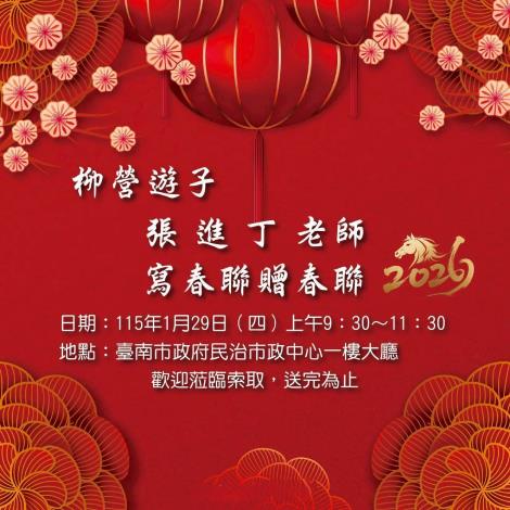為迎接丙午馬年農曆春節到來,目前於民治市政中心展出的「張進丁77歲個展・墨韻人生・返鄉心語」的張進丁老師,將於1/29 (星期四)上午9:30~11:30於展覽現場揮毫書寫斗方春聯,同時邀請知名茶席老師林玉雪、江惠如及李麗珍三位茶席師辦理墨香茶席,讓民治市政大廳充滿新春喜氣洋洋氣氛,歡迎民眾前來共襄盛舉;春聯數量有限,歡迎索取、索完截止。