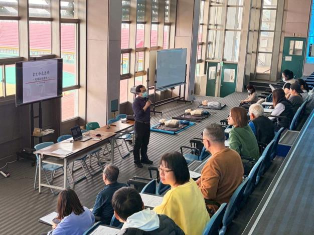 本次研習特別邀請成大醫院急診部張志然醫師擔任講師,課程內容涵蓋心肺復甦術(CPR)理論說明與自動體外心臟電擊去顫器(AED)實際操作,並透過情境演練加深本局所轄運動場館(含認養場地及委外場地)管理人員、相關廠商及承辦人員理解與操作熟練度,研習人員經測驗後皆取得CPR及AED合格證照。