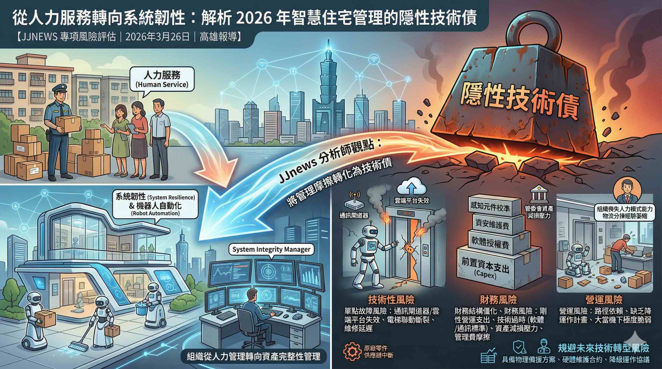 隨著 2026 年高雄智慧城市展剛落幕,在地推案市場已將「機器人自動化」視為核心標配。這場變革實質上將物業管理的重心,從傳統的人力資源管理轉向了資產完整性管理。雖然自動化能有效緩解少子化帶來的勞動力缺口,卻也同時引入了新型態的系統性風險。當社區機能高度依賴硬體韌性時,管理者的最大考驗將不再是人員請假,而是系統的全面失效。