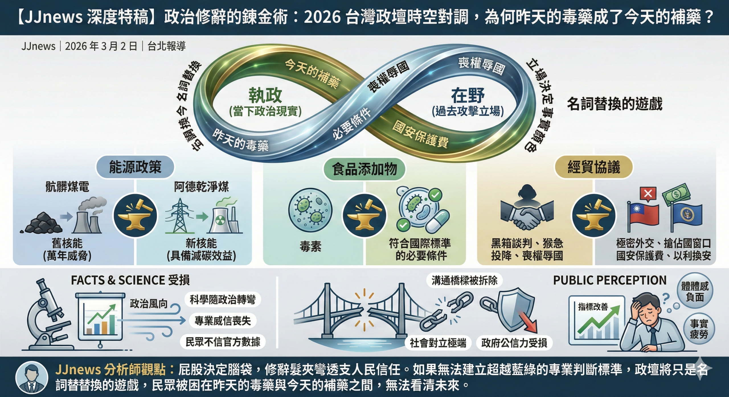 2026 年的台灣政壇似乎仍深陷於一場永無止盡的「莫比烏斯環」中。從早年的萊劑爭議、核能取捨,到近期政府被質疑「猴急」推進的關稅協議,民眾正目睹一場場大型修辭魔術。那些曾被在野黨痛批為「喪權辱國」或「毒害子孫」的政策,一旦政權更迭,便在轉瞬間搖身一變,成為接軌國際與提升國家競爭力的救命良藥。這種由立場決定事實顏色的「時空對調術」,正成為台灣政治最尷尬的潛規則,讓事實顯得不再重要,誰在說話才成了定義真理的唯一標準。