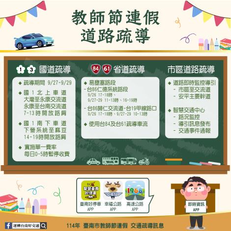 教師節連假(9/27~9/29)自本週六開始,台南市市長黃偉哲籲請市民朋友返鄉出遊前可先做好行程規劃,並責成交通局等相關單位持續監控易壅塞路段、即時發布改道訊息及調整塞車道路號誌,請用路人配合警方疏導,避開可能擁擠路段,節省旅行時間。