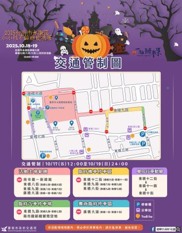 17日至19日《一起府城.打開大街》主題活動於中西區舉辦,全美戲院前停車廣場(民權路二段、永福路二段)18日晚上將進行交通管制。永康區「永康小小孩不給糖就搗蛋」活動於18日至19日舉行,期間封閉康橋大道、康橋九街、康橋八街、康橋六街、康橋二街。「2025吳晉淮紀念音樂會」於18日舉行,期間封閉柳營區界和路部分路段,來往民眾行經活動周邊道路請降低車速,注意行駛。