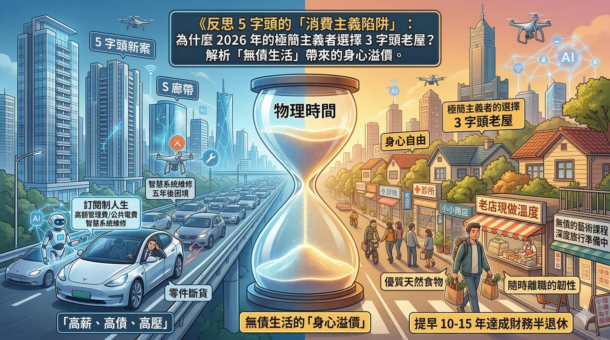 在 2026 年這個一杯手搖飲破百元、物價橫衝直撞的時代,最昂貴的奢侈品不再是鄰近研發中心的景觀窗,而是「不必為了房貸而活」的底氣。揹負長達 40 年的 5 字頭房貸,本質上是將自己長期質押給高壓勞動力市場。極簡主義者的選擇,其實是一場對金融消費主義的溫和罷工。在新舊屋價差擴大的今日,新屋的溢價不僅在於房價,更包含了昂貴的「訂閱制人生」成本,從高額管理費、公共電費到五年後即面臨零件斷貨的智慧系統維修,這是一場必須不斷付錢才能維持生活品質的無盡競賽。