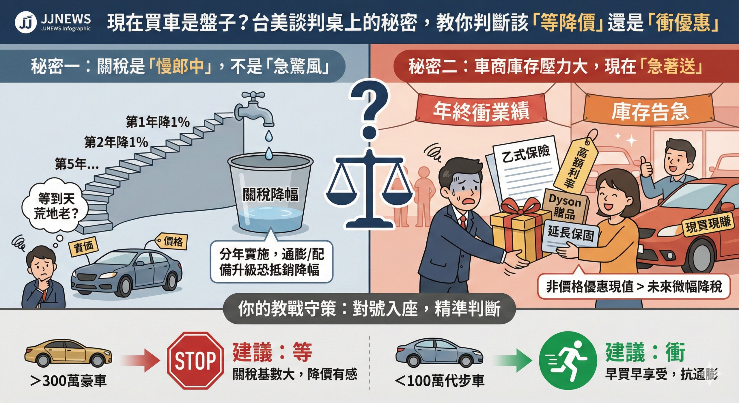 「現在買車會不會現虧 20 萬?」這是最近許多讀者最焦慮的問題。面對台美貿易談判的風聲,消費者陷入了嚴重的觀望,導致近期車市買氣急凍。其實,關稅調降從來不是「明天生效」這麼簡單。 看懂談判桌上的細節,你才不會錯過現在的購車良機,或是傻傻當了最後一隻白老鼠。