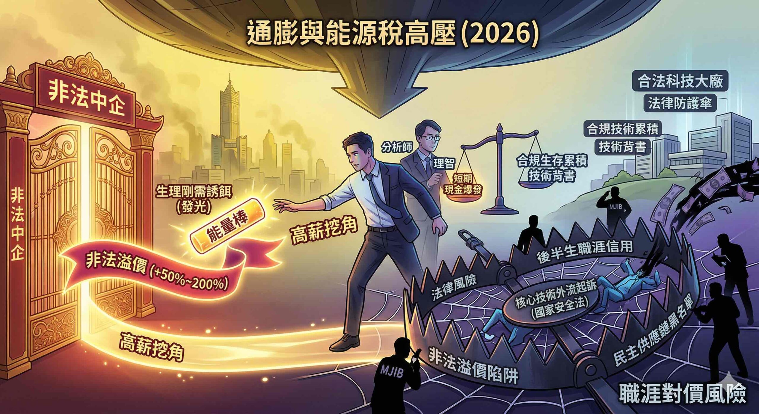 在 2026 年通膨與能源稅雙重壓力下,科技產業近期出現高薪挖角陷阱,調查局對十一家中資企業的大規模掃蕩,揭開了誘人高薪背後的法律風險。專家指出,這類翻倍甚至翻三倍的薪資,本質上並非單純購買專業能力,而是購買受僱者的法律風險與後半生的職涯信用,被定義為非法溢價。