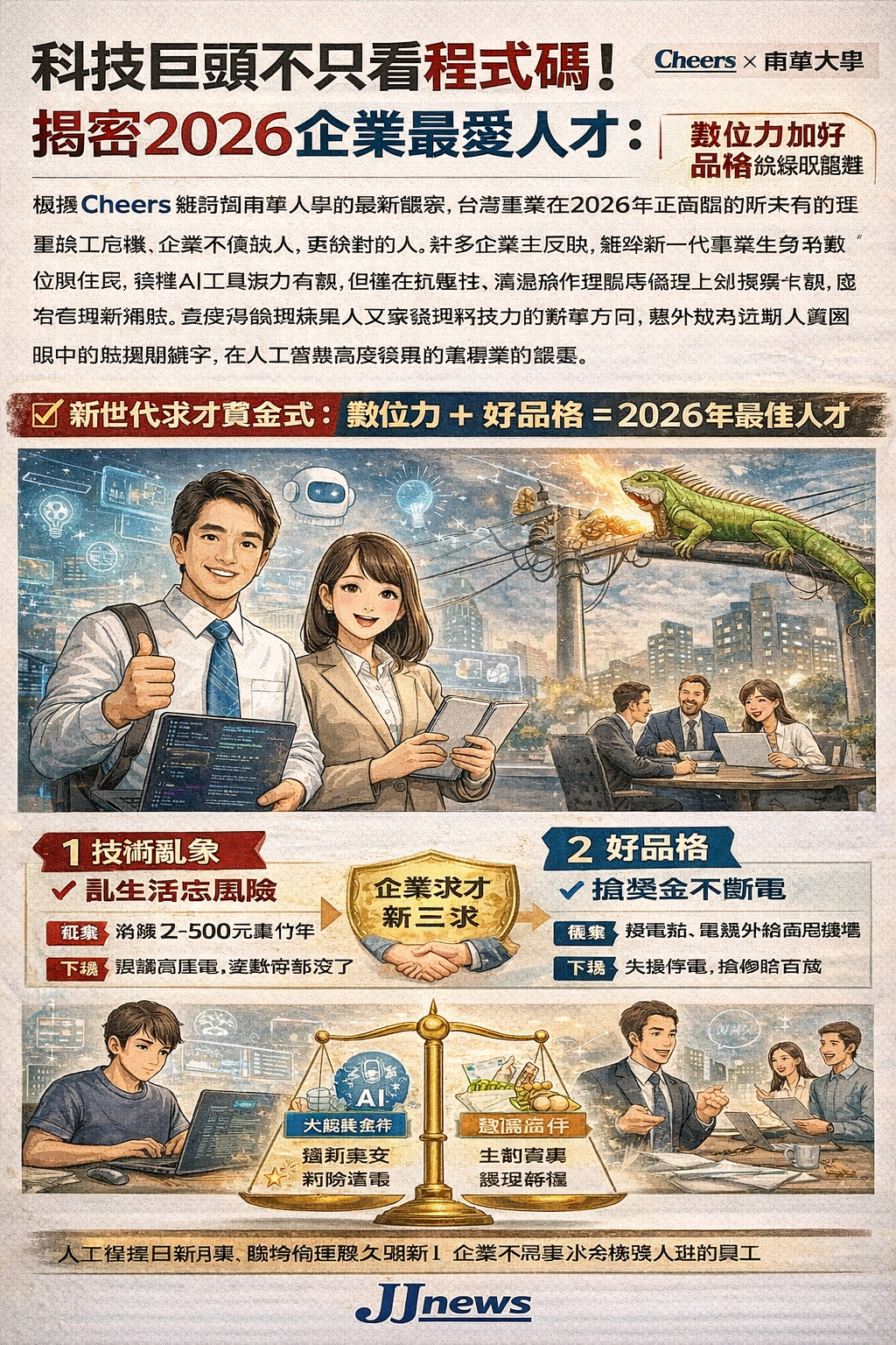 根據Cheers雜誌與南華大學的最新觀察,台灣產業在2026年正面臨前所未有的雙重缺工危機,企業不僅缺人,更缺對的人。許多企業主反映,雖然新一代畢業生身為數位原住民,操作AI工具游刃有餘,但在抗壓性、溝通協作與職場倫理上卻頻頻卡關,成為管理新痛點。這使得強調兼具人文素養與科技力的辦學方向,意外成為近期人資圈眼中的熱搜關鍵字。