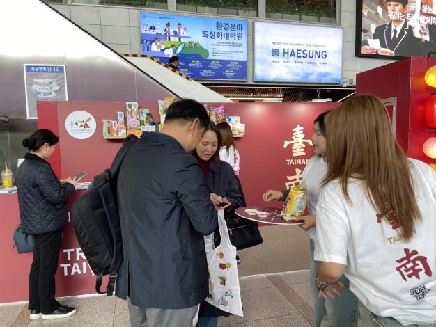 臺南市觀旅局林國華局長表示,本次觀光推廣活動選在首爾火車站舉辦,該站每日人流超過百萬人次,是首爾市區人潮最密集的交通樞紐之一,期透過高人流據點作為宣傳核心策略,將臺南觀光品牌的曝光效益發揮至最大。活動現場以紅磚牆與暖色燈籠營造臺南府城意象,營造濃厚的文化氛圍,吸引旅客駐足拍照打卡,另外除提供臺南旅遊資訊外,亦搭配「IG按讚及填寫問卷送臺南限量小禮」及「臺南果乾試吃」等互動環節,讓韓國民眾以輕鬆有趣方式認識臺南的觀光魅力。