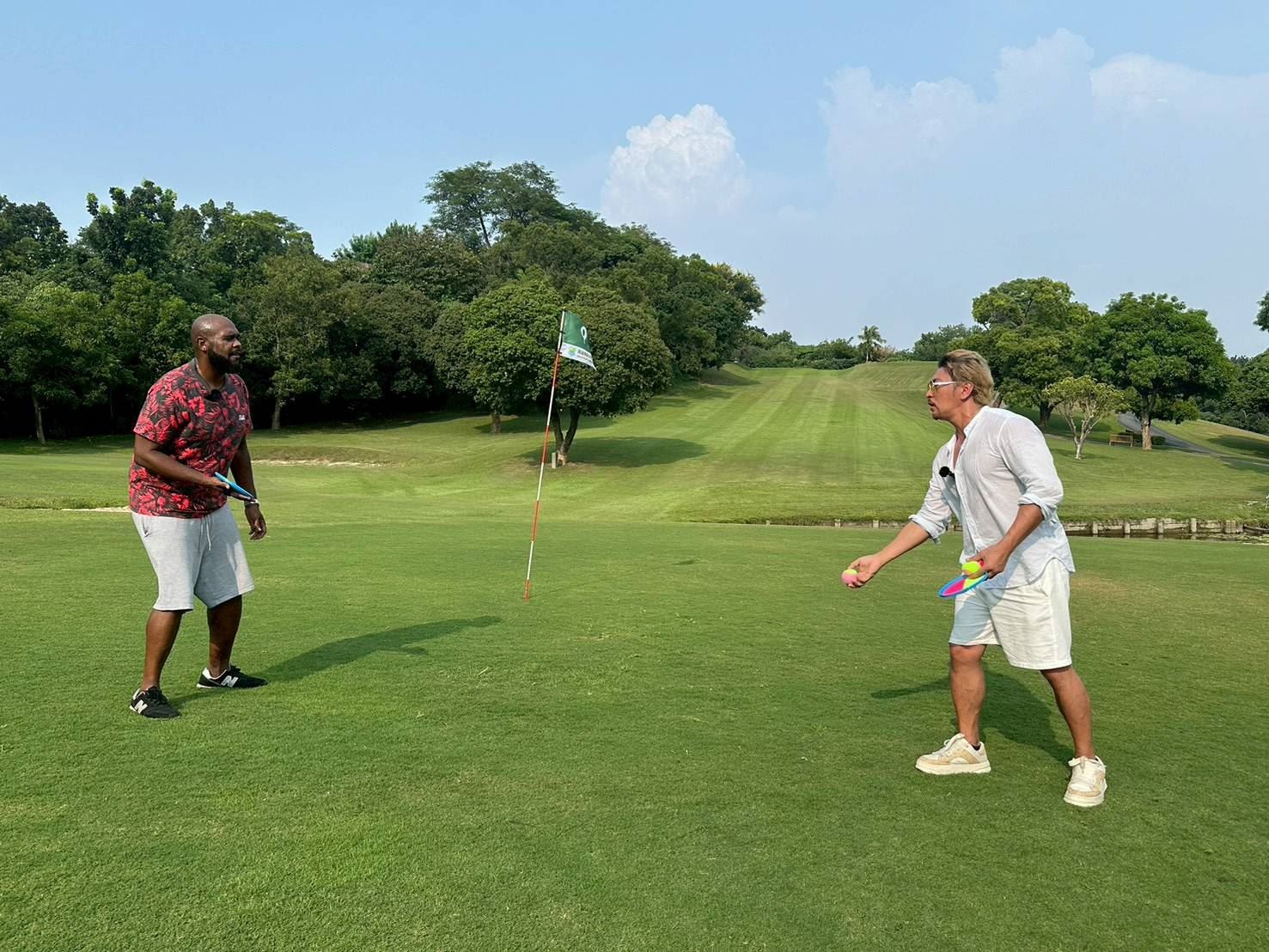 兩人自備道具一路走訪園區各大特色果嶺,從9號果嶺玩起飛盤、抓尾巴、黏巴球等闔家遊戲,勝負結果決定了交通方式:贏家有電動車搭乘到下個目的地,輸家則必須要跑步追上,趣味互動笑聲不斷。接著他們前往10號果嶺,在草地上野餐賞鳥,近距離感受園內豐富的自然生態。