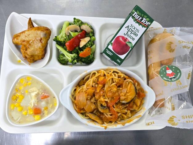 餐點設計方面,各校也融入不同的聖誕巧思,白河國小以番茄、洋蔥、九層塔等多種蔬果製成墨西哥莎莎醬,搭配南瓜胡蘿蔔湯,清爽解膩且富含膳食纖維,有助於腸道健康。永華國小推出義大利肉醬麵、烤雞、蘑菇青花椰菜、濃湯等經典聖誕料理,從濃郁主菜到清爽配菜,再到滑順濃湯,溫暖孩子們的味蕾與身心。善化大同國小除了供應義大利麵、濃湯與漢堡外,還貼心準備枴杖餅乾,讓學童共享節慶氛圍,彷彿一秒置身國外聖誕慶典,展現學校午餐不僅是營養的來源,更是文化體驗與飲食教育的重要平台。