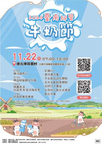臺南市長黃偉哲表示,柳營區素有「牛乳之鄉」美稱,是臺南主要酪農集中區與鮮乳產地。今年,南市府經濟發展局與柳營區公所合作,結合年度產業盛事——「2025臺南柳營牛奶節」,活動將於11月22日於德元埤荷蘭村登場。牛奶節以「在地鮮乳、創生共好」為主題,推廣柳營鮮奶產地形象,展現「八翁酪農專業區」特色,深化民眾對柳營酪農文化的認識,並帶動地方觀光與農業價值提升,呈現臺南多元而深厚的在地能量。