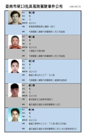 為提升交通安全友善空間,台南市制定高風險駕駛事件資訊公開作業原則,透過主動公開高風險駕駛事件資訊維護交通安全,今(21)日公布第13批高風險駕駛名單共11人,其中有3人涉嫌肇事逃逸致人死傷的駕駛人,交通局呼籲駕駛人除要避免高風險駕駛行為,也要保持防禦駕駛的觀念,才能確保行車用路安全。