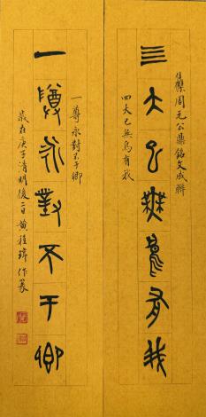 黃程瑋老師表示,書法創作是一條漫長而充實的道路,每一次揮毫都是與穿越亙古、並與自我對話的過程。這次展覽作品中,破體聯「莫怪坐來頻勤酒,自從別來見君稀」集合篆隸草行楷各書體,布局筆畫間相互融合,筆調乾濕潤燥穿插進行,打破傳統單一書體的框架,呈現了當代書法藝術精髓的多元可能性;如同享用自助餐一樣的樂趣,無論日式、法式、美式盡可出現在您的餐盤之中。另件篆隸楷混用的集帛書作品「濺財而貴有知」則取法古帛書的質樸韻味,其實書法的各體轉換,都是經過漫長變革,其中包括各種字體混用,或是因書寫載體的不同而產生的字體變畫,這些都是創作時的養分。這兩件帛書與破體聯作品,展現在傳統與創新間尋求突破的藝術追求及「游於藝」的實踐。