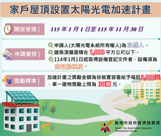 經濟發展局局長張婷媛指出,為配合中央推動再生能源政策及臺南市家戶屋頂光電發展方向,本局向中央爭取「家戶屋頂設置太陽光電加速計畫」,並依推動實務需求修訂相關作業規範,鼓勵自然人參與屋頂光電設置,目前獎勵補助計畫已定案,民眾如屬114年1月1日起取得設備登記文件者,則可於115年1月1日起至115年11月30日期間提出獎勵申請。