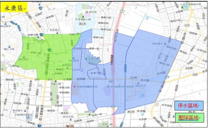 本次因停水施工,用戶用水壓力影響區域為:臺南市永康區、安平區、東區、中西區、北區、玉井區、南化區、安定區、新化區、左鎮區、善化區、大內區、山上區、新市區、歸仁區、關廟區、龍崎區、仁德區,影響戶數共計321,919戶(停水戶數243,216戶,水壓降低戶數78,703戶),除停水及水壓降低區域外,其餘地區可正常供水。復水初期水質可能較為混濁,請用戶暫勿取用,俟水清後再進水。