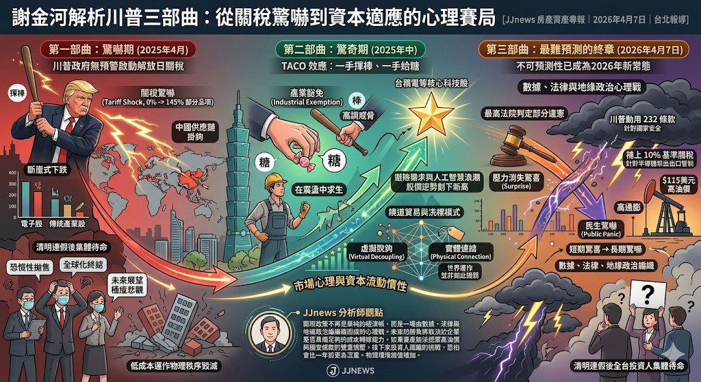 清明連假後的交易日,全台投資人的情緒正處於一種集體待命的狀態。針對對等關稅政策屆滿 1 週年,財信傳媒董事長謝金河提出了著名的川普三部曲,這不只是對未來的預測,更是資本市場在面對高度不可預測性時的實戰演習。謝金河將過去一年的演變拆解為三個關鍵階段,解析情緒如何被政策精準調度。