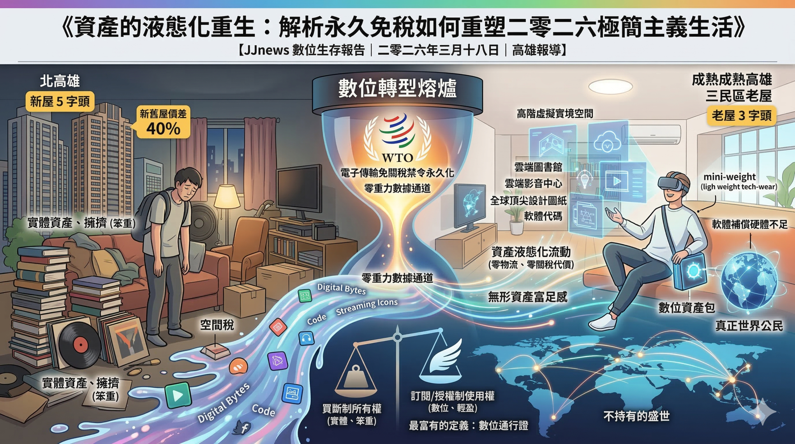 二零二六年三月十八日,隨著世界貿易組織推動電子傳輸免關稅禁令走向永久化,這不僅是全球貿易商的利多,更是對人類擁有權概念的一次終極拆解。在物理空間極度昂貴且新舊屋價差飆破百分之四十的時代,高雄三民區的極簡主義者正帶領一場無聲的革命。他們主動放棄沉重的實體資產,將生活縮減為一串串跨國流動的電子信號。當擁有變得笨重,使用權變成了二零二六年最輕盈的生存姿態。