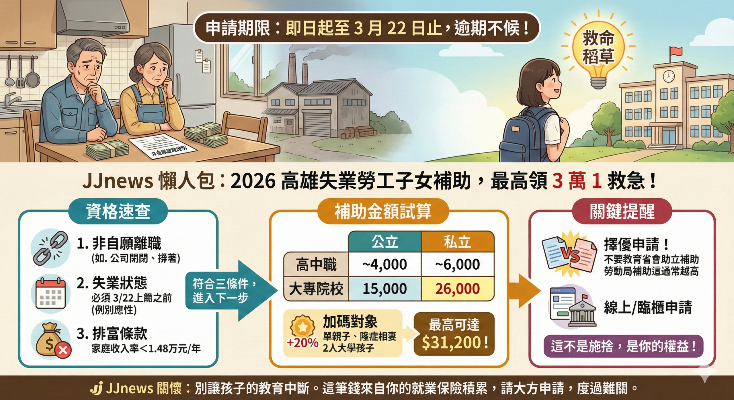 在這物價飛漲的 2026 年,不是每個人都在科技業領高薪。為了協助遭到裁員或工廠倒閉的家庭度過難關,高雄市勞工局於今日(2月9日)宣布,114 學年度第 2 學期(2026 春季班)失業勞工子女就學補助即日起正式開跑。只要符合非自願離職等資格,且子女就讀國內高中職或大專院校,每名子女最高可領 31,200 元。申請期限至 3 月 22 日止,逾期不候,這筆錢對於許多傳產或服務業的中年失業者來說,無疑是開學季的救命稻草。