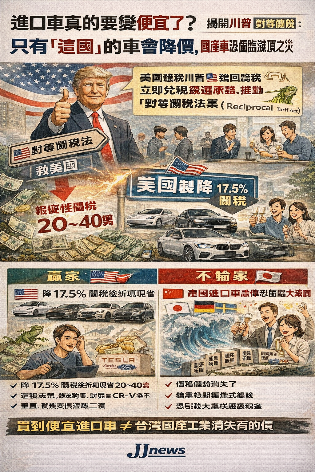 美國總統川普強勢回歸後,迅速兌現競選承諾推動「對等關稅法案」,點名對美享有鉅額貿易順差的台灣,必須將關稅降至與美國同等水準,否則將面臨最高32%的報復性關稅。市場盛傳,政府為了保住半導體與伺服器等科技業出口命脈,可能被迫棄守汽車關稅壁壘,將現行17.5%的美國進口車關稅大幅調降甚至歸零。這項消息雖讓不少想入手特斯拉的民眾歡呼,但專家示警,這把關稅大刀砍的不只是稅率,更將重創台灣維持數十年的汽車產業結構。