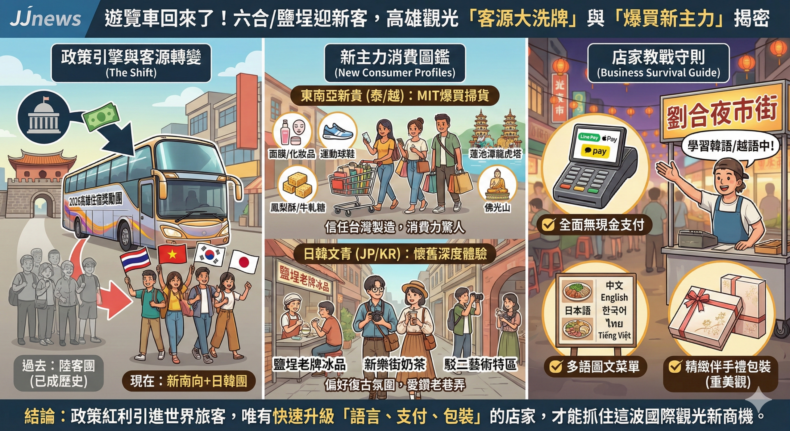 面對這群新面孔,在地店家的經營策略也必須與時俱進。專家建議,伴手禮的包裝設計應更講究精緻與美觀,以符合日韓與泰國旅客的送禮需求;同時,隨著無現金支付普及,店家必須確保能支援Line Pay、Apple Pay甚至韓國Kakao Pay等國際支付工具。此外,準備一份包含中、英、日、韓、泰等多語對照的圖片菜單也成為基本功。這波政策紅利將把世界各地的旅客帶進高雄,唯有能快速適應新客人胃口與消費習慣的店家,才能在新的觀光時代中掌握商機。