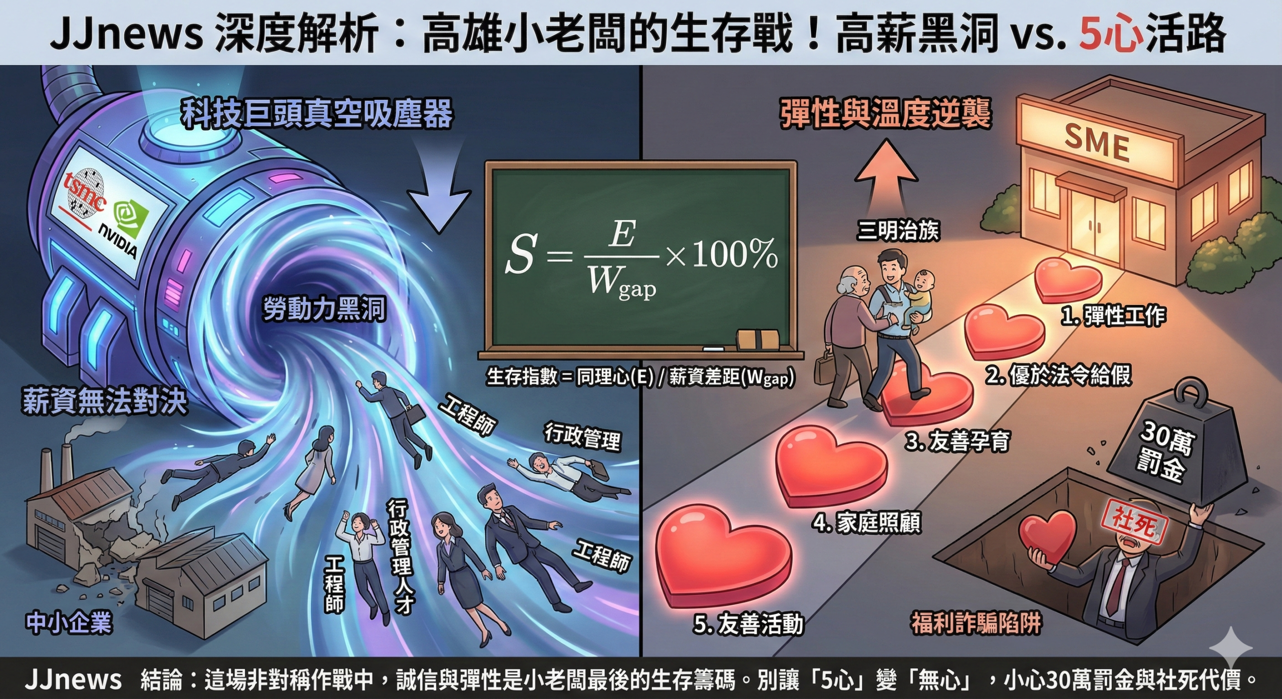 2026 年的高雄職場正處於一場前所未有的「勞動力黑洞」風暴中。隨著台積電楠梓廠與鴻海橋頭電池廠進入全速量產期,加上 NVIDIA 在亞灣區的算力中心正式啟用,南台灣的就業市場呈現極端的人才兩極化。這些口袋深不見底的科技巨頭,正如同巨型真空吸塵器般吸走所有的工程與行政管理人才。對於高雄廣大的中小企業主而言,如果還想沿用「南部薪資低、共體時艱」的舊思維,恐怕不僅是招不到人,更可能面臨在 2026 年徹底熄燈的存亡危機。面對這場不公平的競爭,勞動部近期推出的「有心召你來~5心友善職場」政策,或許是給予小公司最後一條「非貨幣競爭」的活路。