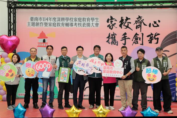 台南市家庭教育中心今(26)日於永華市政中心2樓中庭舉辦「台南市114年深耕學校家庭教育學生主題創作暨家庭教育輔導考核表揚大會」,表揚4所考核特優學校及22組創作特優學生。市長黃偉哲在活動前特別抽空前往欣賞作品及向學生致意,並由市府副秘書長徐健麟代表頒獎表揚,市議員沈震東與立委林俊憲、陳亭妃服務處代表及各議員服務處代表也到場關心。