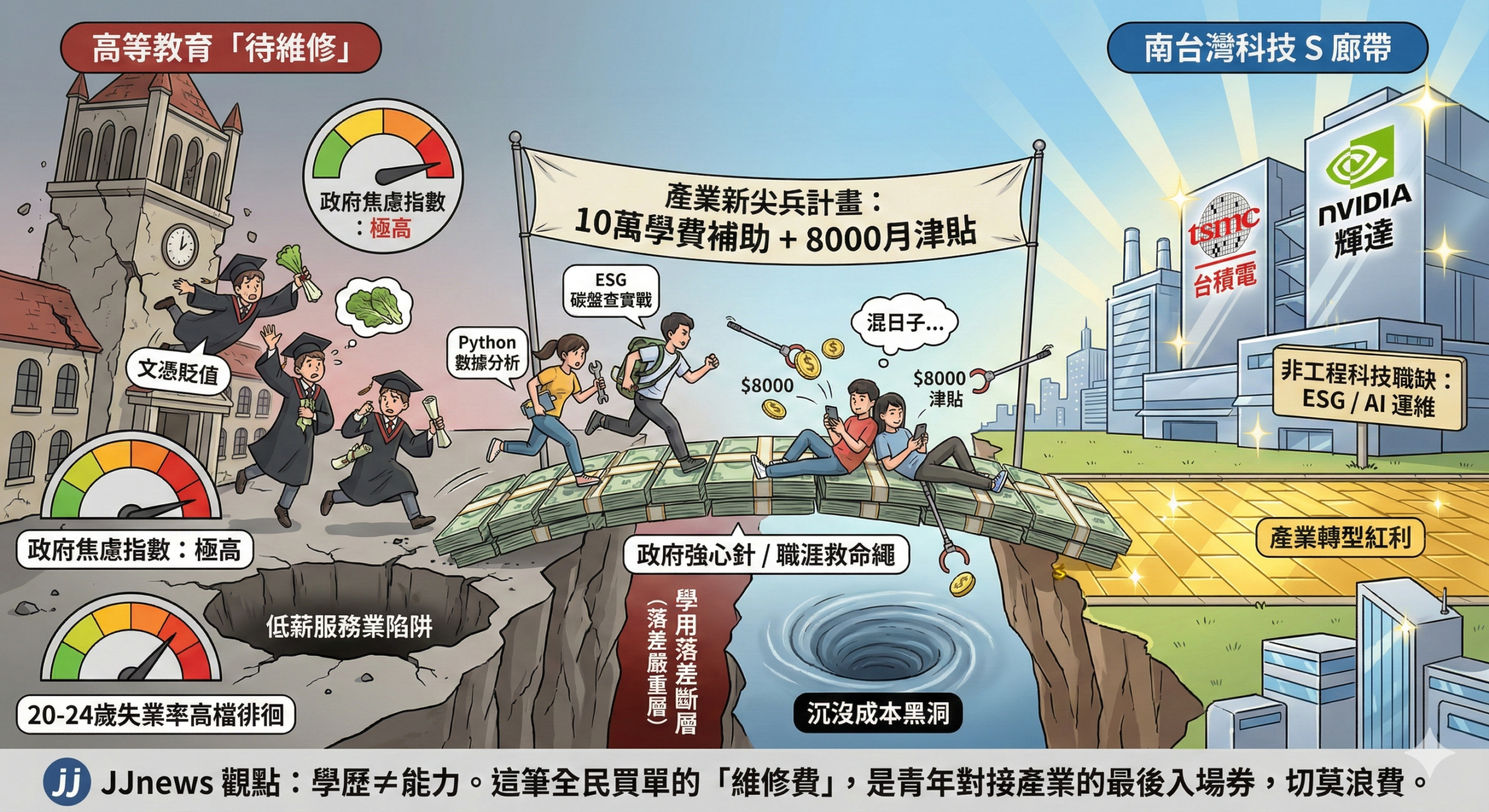 2026 年的南台灣正處於產業轉型的熱點,台積電高雄廠與輝達(NVIDIA)研發中心等科技巨頭陸續進駐,將高雄從工業重鎮推向半導體 S 廊帶的核心。然而,在科技業一片榮景的同時,勞動部卻宣布持續擴大「產業新尖兵計畫」,針對 15 至 29 歲青年提供最高 10 萬元的訓練費補助與每月 8,000 元的獎勵金。這項看似大撒幣的政策,實則反映出政府對南台灣「結構性失業」的極度焦慮:當世界級企業來了,本土年輕人的學歷卻與產業需求出現了嚴重的「售後斷層」。