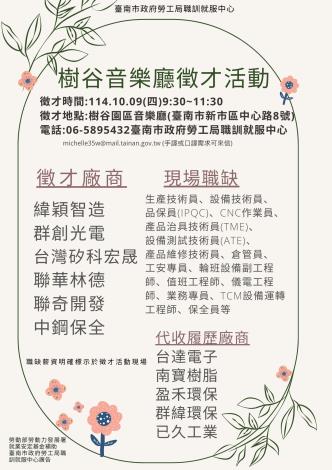 114/10/09(四)勞工局職訓就服中心辦理樹谷園區音樂廳小型徵才活動,歡迎求職民眾踴躍參加。