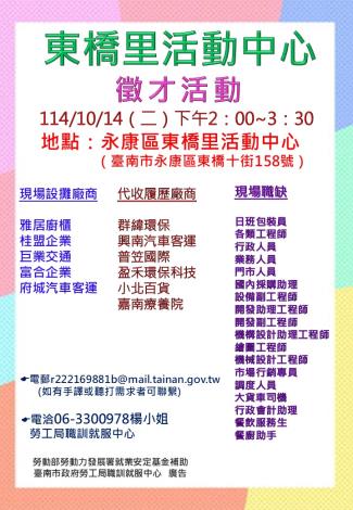 為打造黃偉哲市長「希望家園」的施政願景,勞工局積極辦理各項就業徵才活動,並因應產業求才需求,勞工局職訓就服中心將於114年10月14日(週二)下午2時至3時30分在永康區東橋里活動中心(臺南市永康區東橋十街158號)辦理廠商聯合徵才活動,邀請11家廠商提供186個職缺,歡迎求職民眾踴躍前往參加,洽詢電話:06-3300978。