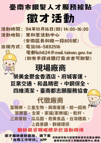 為打造黃偉哲市長「希望家園」的施政願景,勞工局積極辦理各項就業徵才活動,並因應產業求才需求,臺南市銀髮人才服務據點將於10月16日(四)下午2點至4點舉辦聯合徵才活動,地點於東和里活動中心(臺南市安南區長和路一段805號),邀請21家廠商提供746個職缺,歡迎求職民眾踴躍前往參加,洽詢電話:06-5832516。